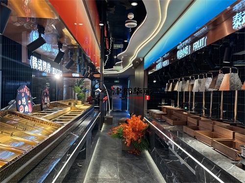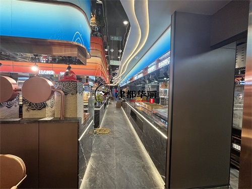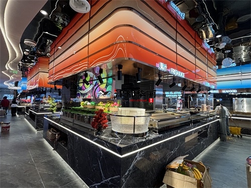 今天分享的是西吉回香渔自助餐厅装修设计实景,这家自助餐厅装修设计将“潮流科技感”与“轻奢休闲风”两种风格巧妙融合在一起,既贴合当下年轻消费群体的审美偏好,又通过空间层次的营造兼顾了自助餐饮的功能需求,是近年餐饮空间设计的典型流行范式。前厅的顶面与墙面采用波浪形的曲面造型,搭配橙红、宝蓝等高饱和度渐变色彩,叠加内嵌式线性灯带的勾勒,既打破了传统餐厅的规整感,又通过科技感的光影营造出“赛博休闲”的氛围——这种手法既借鉴了网红餐饮的“打卡属性”设计,又通过色彩分区(如橙红对应热菜区、宝蓝对应海鲜区)实现了功能引导,让顾客能快速识别餐区类型。